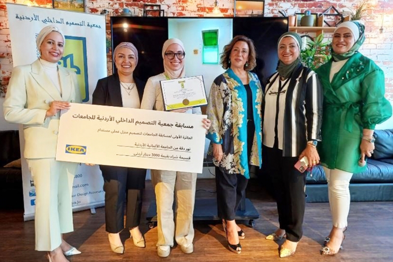 فازت الطالبة نور دقة من كلية هندسة العمارة والبيئة المبنية في الجامعة الألمانية الأردنية بالمركز الأول في المسابقة السادسة لطلاب التصميم الداخلي في الجامعات الأردنية التي نظمتها جمعية التصميم الداخلي الأردنية "JIDA بالتعاون مع ايكيا لتصميم بيت بيئي مستدام.