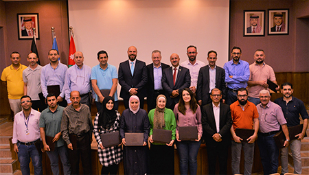 رعى نائب رئيس الجامعة الألمانية الأردنية الأستاذ الدكتور مالك الشرايري حفل تخريج ستة وعشرون موظف وموظفة من العاملين في المشتريات ولجان الشراء والاستلام من مختلف دوائر الجامعة الذين شاركوا في دورة "نظام المشتريات الحكومية رقم (8) لسنة 2022"، التي نظمها مركز الاستشارات والتدريب في الجامعة.