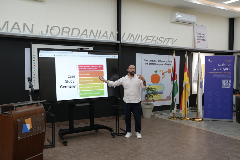 نظّمت كلية هندسة وإدارة الموارد الطبيعية في الجامعة الألمانية الأردنية ورشة العمل الأولى ضمن مبادرتها "تعزيز إعادة التدوير والاقتصاد الدائري في الأردن"، والتي جاءت تحت عنوان: "ورشة عمل حول إعادة تدوير النفايات الصلبة: حلول مستدامة من أجل مستقبل أكثر خضرة"، وقدّمها الدكتور يعقوب الخصاونة، عضو هيئة التدريس في الكلية.