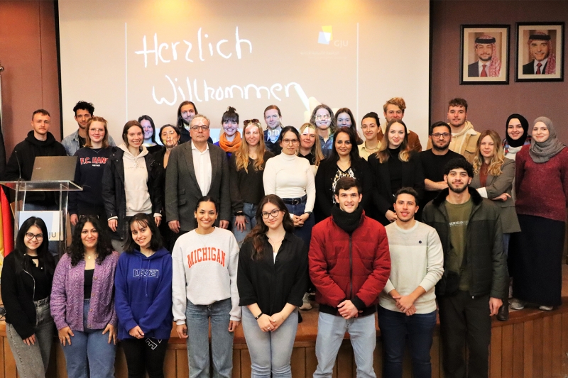 نظمت دائرة العلاقات الدولية في الجامعة الألمانية الأردنية لقاء ترحيبيا بالطلبة الدوليين الجدد الملتحقين ببرامج الجامعة للبكالوريوس والماجستير والدبلوم على الفصل الدراسي الثاني من العام الجامعي 2022/2023 والبالغ عددهم لهذا الفصل 25 طالبا وطالبة من جنسيات مختلفة، من 17 جامعة شريكة مختلفة في ألمانيا وواحدة من سويسرا.