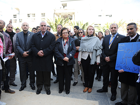 The President of GJU Prof. Manar Fayyad, Vice- Presidents, hundreds of students and academic and administrative staff participated in the protest to express their rejection of the decision and support AlQuds.