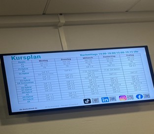 The training at IIK began the next day. The institute staff gave my colleague and me a tour of the building, so we could familiarize ourselves with all the rooms and activities. One helpful feature was a screen displaying the course schedule and room locations, which made it easy for students and visitors to find their way around.