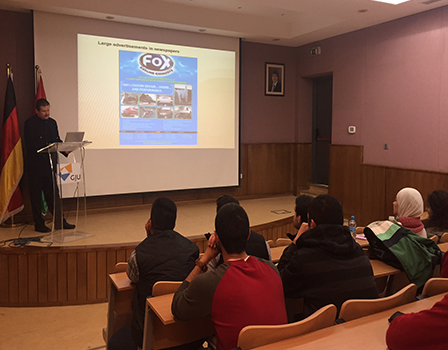 As Dr. Löbl explained in his presentation, Chance-Mall promotes the Arab region to small and medium-sized enterprises in Germany. These so-called Hidden Champions of the German economy provide cutting-edge technology to a global market. While largely unknown to the wider public, they can be global market leaders in their specific products. Dr. Löbl already has arranged a number of successful German-Arab partnerships, not only in the Gulf countries but also in Jordan. He now wants to help his clients, small and medium-sized enterprises in Germany, to develop new and expand existing partnerships with the help of GJU students, amongst others.
