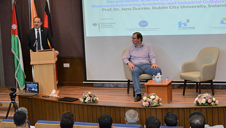 Dr. Jens Ducrée, a Full Professor of Microsystems in the School of Physical Sciences at Dublin City University in Ireland, conducted a presentation on Microfluidics – A Paradigm for Decentralized Science in a Blockchain-Enabled Metaverse within the German Jordanian Discourse Series at the German Jordanian University (GJU) in the presence of the President of GJU Prof. Ala’aldeen Al-Halhouli, academic members and students.