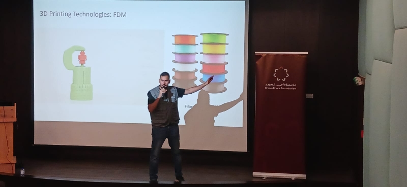 من جهته، تحدث أحمد فارس، ممثل "مساحة الصناع" في مؤسسة ولي العهد، عن مركز دعم الابتكار والتصنيع الرقمي في المؤسسة، الذي يهدف إلى تعزيز مهارات الشباب الأردني في مجالات التصنيع المتقدمة. وأوضح أن المركز يضم عدة أقسام متخصصة، مثل الطباعة ثلاثية الأبعاد، والمعادن والأخشاب، والإلكترونيات، بالإضافة إلى محطات التصميم والقطع بالليزر.