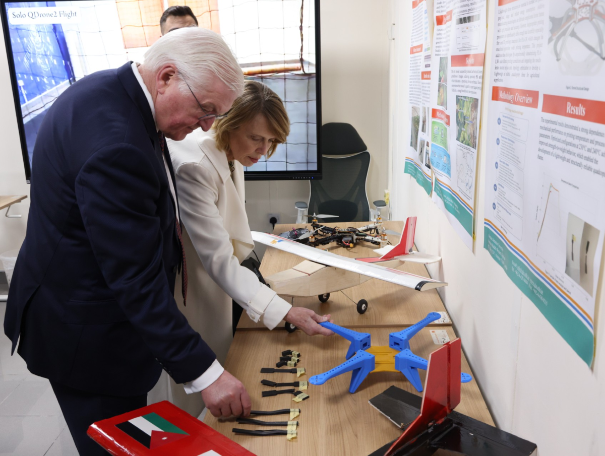 وزار شتاينماير مختبر الروبوتات والأنظمة الذكية، واطّلع على أحدث المشاريع البحثية في مجال الروبوتات الأرضية والجوية وتطبيقاتها في الزراعة الذكية والأنظمة ذاتية القيادة، واستمع إلى عرض موجز حول التقنيات المتقدمة المستخدمة، ودور الروبوتات الجوية في مراقبة المحاصيل وتحليل البيانات الزراعية بما يسهم في تعزيز الإنتاجية والاستدامة البيئية، إضافة إلى تطبيقات بناء الخرائط والملاحة الذاتية.