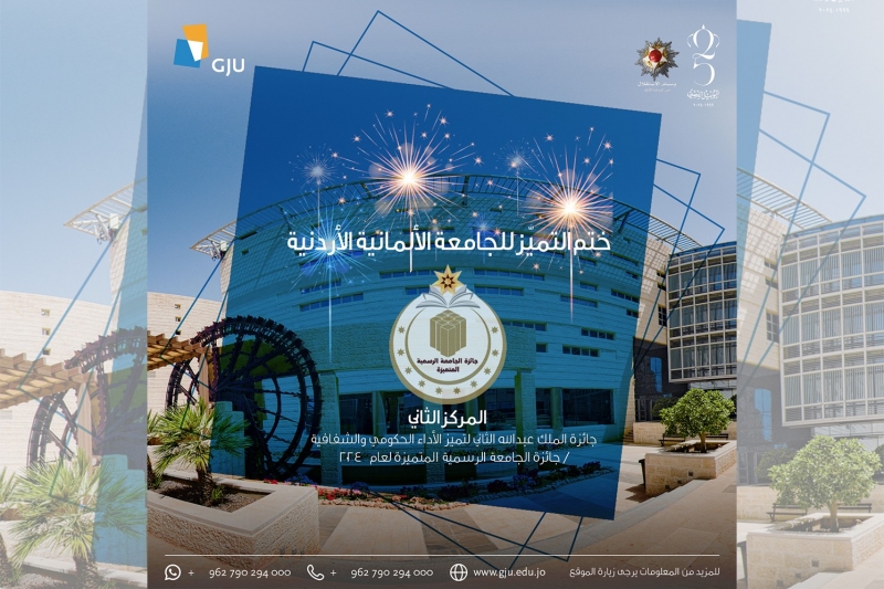 حصدت الجامعة الألمانية الأردنية إنجازًا جديدًا يعزز مكانتها الأكاديمية والبحثية على المستوى الوطني، حيث نالت ختم التميّز بالإضافة إلى حصولها على المركز الثاني في جائزة الجامعة الرسمية المتميزة لعام ٢٠٢٤ ضمن جوائز الملك عبدالله الثاني لتميز الأداء الحكومي والشفافية .