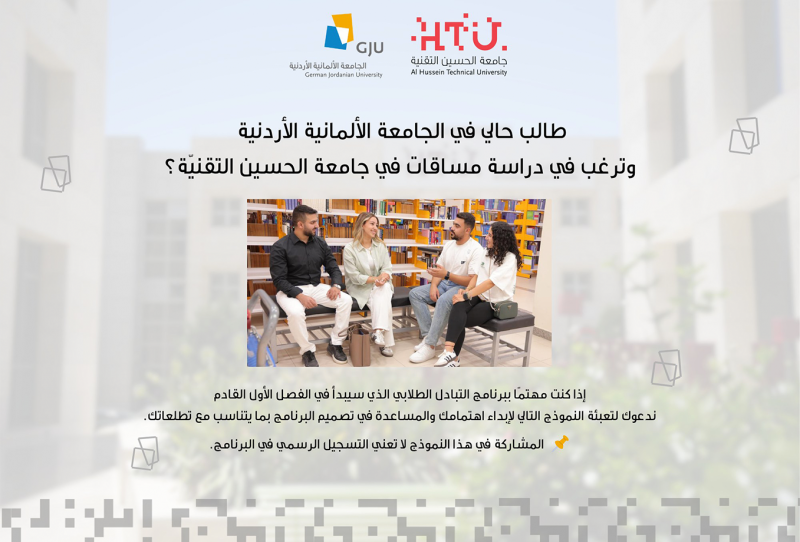يسعدنا أن نعلن عن فرصة مميزة للطلاب للدراسة لمدة فصل دراسي في جامعة الحسين التقنية (HTU) ضمن برنامج التبادل الأكاديمي المشترك بين جامعة الحسين التقنية والجامعة الألمانية الأردنية (GJU).