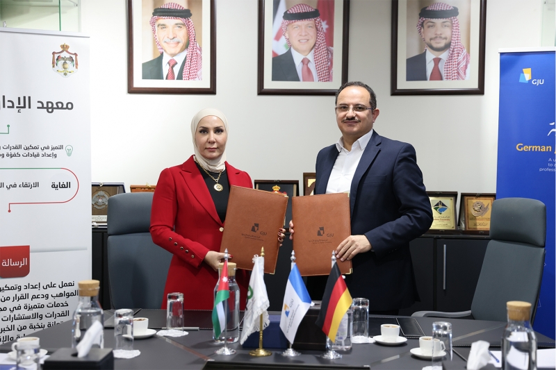 وقعت الجامعة الألمانية الأردنية ومعهد الإدارة العامة، مذكرة تفاهم بهدف تعزيز الشراكة في مجالات البرامج التدريبية الإدارية المتنوعة، وتكنولوجيا الذكاء الاصطناعي، والتحول الرقمي.