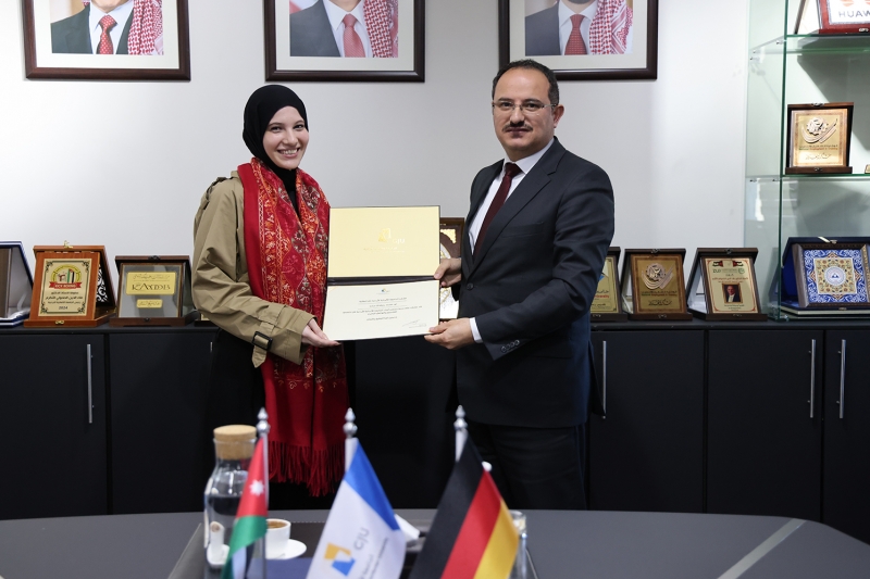 سلم رئيس الجامعة الألمانية الأردنية، الأستاذ الدكتور علاء الدين الحلحولي، المنحتين الدراسيتين الكاملتين المقدمتين من مجلس أمناء الجامعة للطلبة المتفوقين في الثانوية العامة (التوجيهي الأردني)، وذلك خلال حفل مميز حضره نائب رئيس الجامعة، الأستاذ الدكتور مالك الشرايري، وعدد من العمداء، إلى جانب أهالي الطلبة.