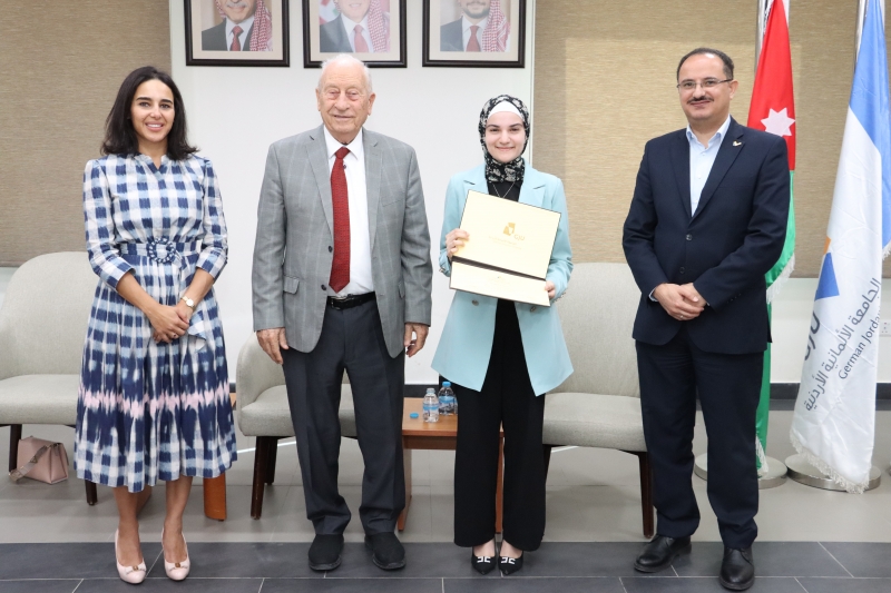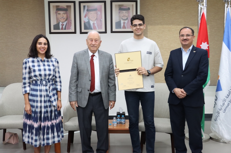 سلم رئيس مجلس أمناء الجامعة الألمانية الأردنية المهندس عثمان بدير بحضور رئيس الجامعة الأستاذ الدكتور علاء الدين الحلحولي المنحتين الدراسيتين الكاملتين المقدمتين من مجلس أمناء الجامعة للطلبة المتفوقين في الثانوية العامة - التوجيهي الأردني.