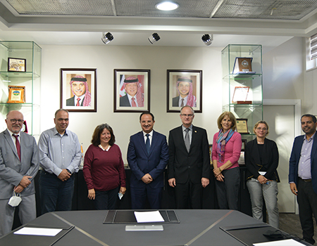 زارت المديرة الاقليمية للوكالة الألمانية للتعاون ا الدولي (GIZ) السيدة إليزابيث جيرباخ ومدير فرع التعليم المهني الموجه نحو سوق العمل والتعليم العالي والتدريب البروفيسور فولفغانغ فروبيرج بزيارة الجامعة الألمانية الأردنية والتقيا مع رئيس الجامعة الأستاذ الدكتور علاء الدين الحلحولي، ونائب الرئيس للشؤون الدولية البروفيسور رالف روسكوبف، وعميد عمادة الابتكار ونقل التكنولوجيا وريادة الأعمال الدكتور نضال الشواورة، ومدير مكتب الاتصال مع الصناعة بريتا كيلر، ومستشارة الدراسات الثنائية سيمون ستراسبيرغر، والدكتور إبراهيم الرفاعي، مستشار الدراسات الثنائية.
