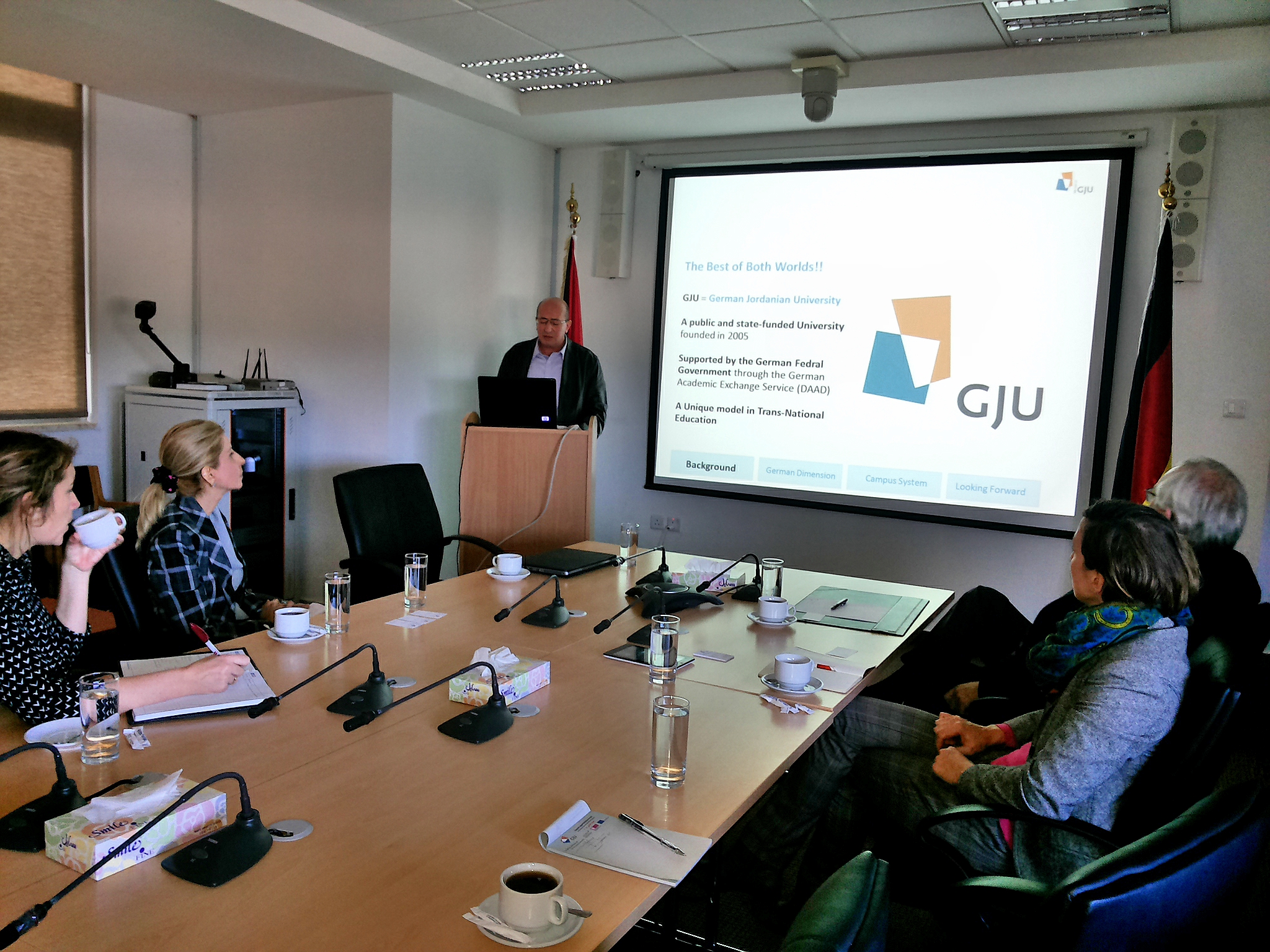 Dr. Yasser Rajjal, Assistant to the President for Communications and Public Relations, gave a brief overview about GJU, the establishment, achievements, and challenges; also he demonstrated several features, which made GJU a unique model in transnational education.