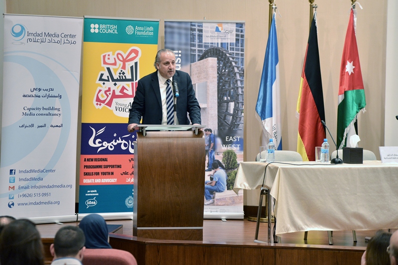 GJU President Professor Natheer Abu Obeid said that GJU is a house of enlightenment, works as a German machine, and supports any  program that can help students to express their  opinions like the Young Arab Voices Program that offers an excellent  platform for students to practice their public debate skills.