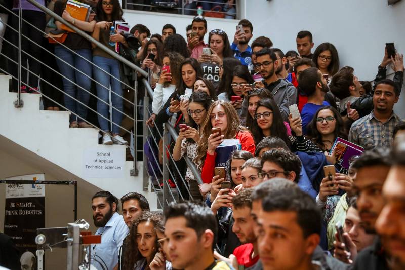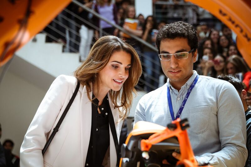 Accompanied by the Chairman of GJU Board of Trustees Eng. Othman Bdeir, GJU President Prof. Natheer Abu Obeid and GJU Vice Presidents Prof. Manar Fayyad and Prof.  Anton Mangstl, Queen Rania also visited an exhibition showcasing projects by students in the robotics club.