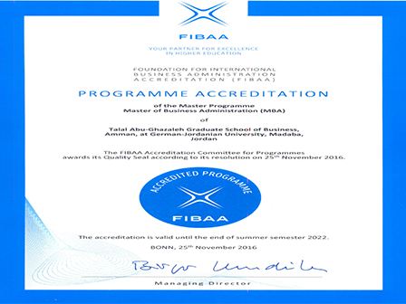 Talal Abu-Ghazaleh Graduate School of Business / German Jordanian University MBA Program has earned a seven year renewal of its accreditation (valid until the end of Summer Semester 2022) from the Foundation for International Business Administration Accreditation (FIBAA).
