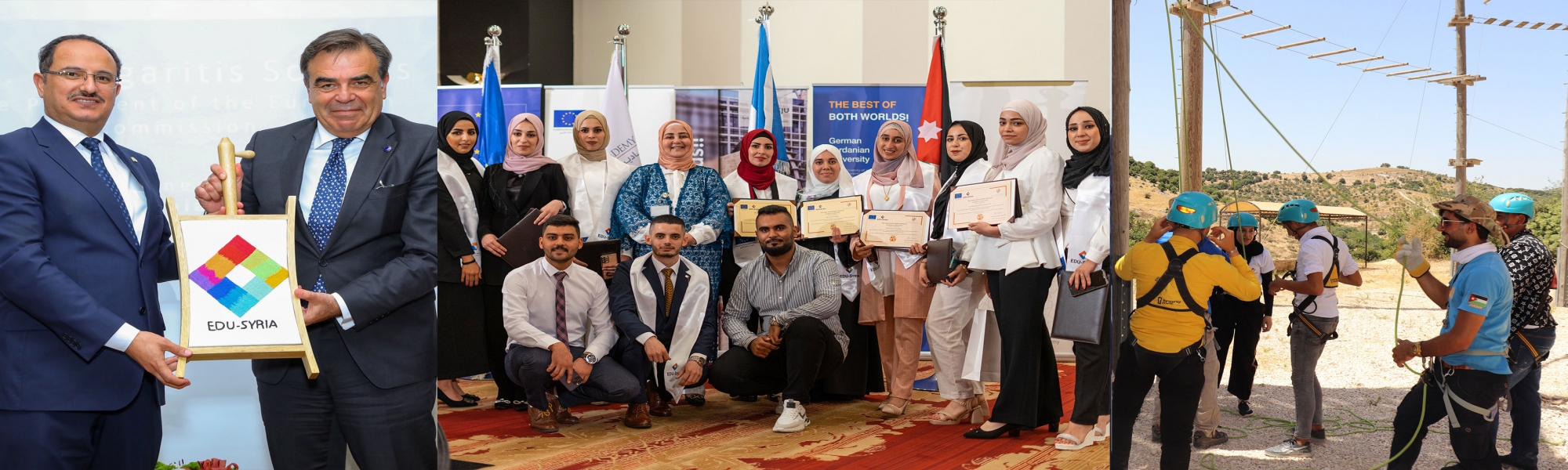 The programme is implemented by the German Jordanian University in collaboration with a consortium of 10 international and local organizations, as well as public and private academic institutions. Partners include the German Academic Exchange Service (DAAD), the Netherlands Universities Foundation for International Cooperation (NUFFIC), Queen Rania Teacher Academy (QRTA), Jordan University for Science and Technology (JUST), Yarmouk University (YU), Mutah University (MU), Zarqa University (ZU), Princess Sumaya University for Technology (PSUT), Luminus Technical University College (LTUC), and Luminus Jordan Start. EDU-SYRIA also works closely with the United Nations High Commissioner for Refugees (UNHCR) to assess the eligibility of Syrian refugees for the scholarship programs. Additionally, partnerships with prominent Jordanian humanitarian organizations, such as the National Aid Fund, Tkiyet Um Ali, Al-Aman Fund, and Zakat Fund, help identify and support economically disadvantaged beneficiaries in Jordan.