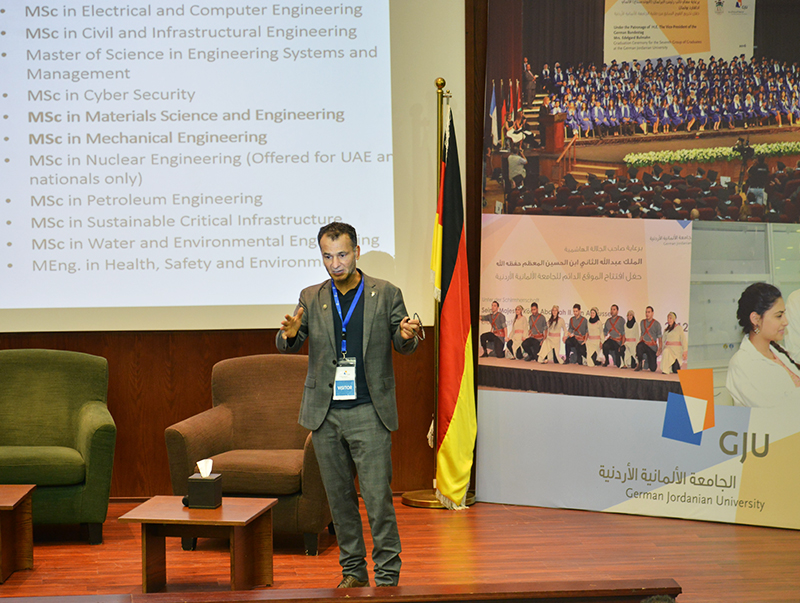 Dr. Al-Halhouli presented a brief about the university, the establishment, the German dimension, the German Year, and the various partnerships and projects between the two sides. Dr. Alhalhouli stressed that GJU vision to be internationally recognized as an applied science university and a leader in education besides growing partnerships with educational institutions, and developing initiatives and projects that serve the younger generation.