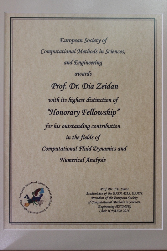Recently, invited by the European Society of Computational Methods in Sciences and Engineering (ESCMSE), Greece, Dia Zeidan from the School of Basic Sciences and Humanities was awarded the 2016 Honorary Fellowship Young Scientist Excellence Award in Computational Fluid dynamics and Numerical Analysis by ESCMSE, along with other winners from New Zealand, Germany and USA. The official awards ceremony took a place during the 14th International Conference of Numerical Analysis and Applied Mathematics which was held on 19-25, September 2016 in Rhodes, Greece.