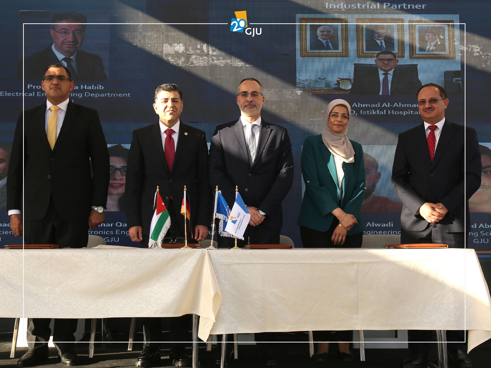 In this context, a cooperation agreement was signed among the three universities: GJU, represented by its President Prof. Alaaldeen Al-Halhouli; JUST, headed by Prof. Khalid Al-Salem; and HTU, headed by Prof. Ismael Saleh Al-Hinti, along with Al-Istiklal Hospital, represented by its CEO Mr. Ahmed Al-Ahmad.
