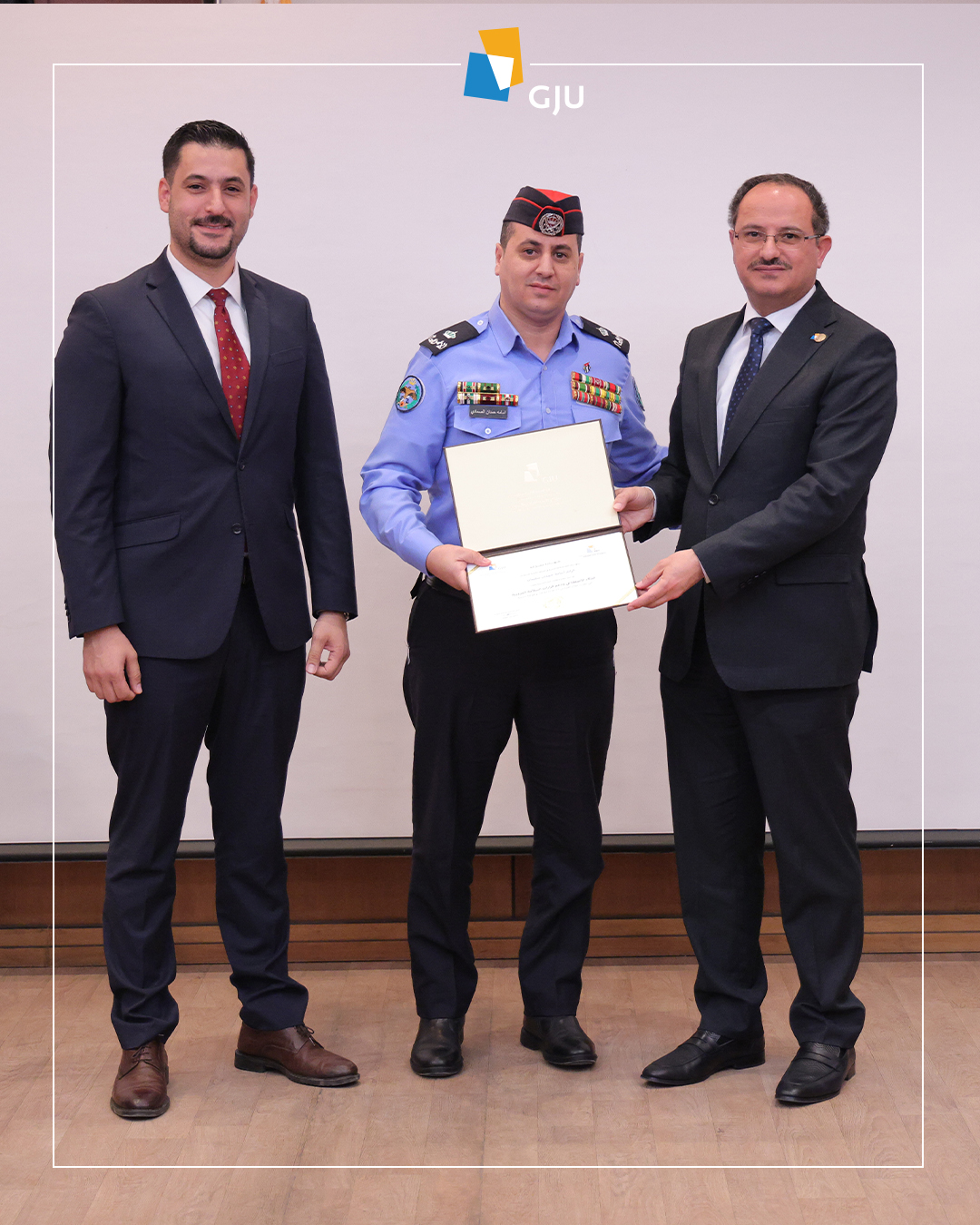At the conclusion of the event, participants graduated and received their certificates, with an emphasis on the continued collaboration between GJU and the Public Security Directorate to implement advanced training programs contributing to institutional performance development and the advancement of the traffic safety system in the Kingdom.