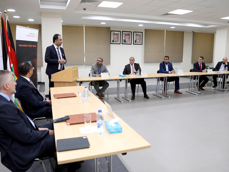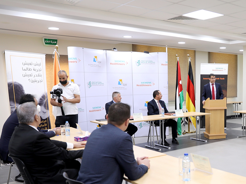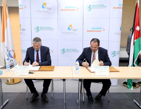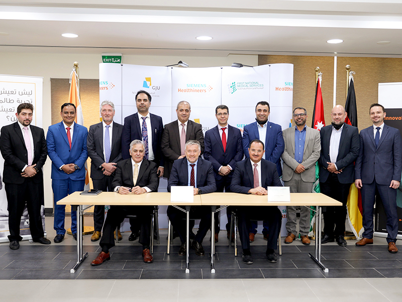The German-Jordanian University (GJU), represented by its president, Prof. Ala'aldeen Al-Halhouli, signed a memorandum of understanding (MoU) with Siemens Healthineers, represented by Mr. Ole Per Maloy, Managing Director of Siemens Healthineers Middle East, Southern & Eastern Africa and the First National Medical Service, represented by its founder, Mr. Ahmed Abdul Hadi. Being the first of its kind in the Kingdom of Jordan and only the second one in the Middle East, this agreement is aiming to establish a specialized Innovation Think Tank laboratory to support innovative thinking on campus.