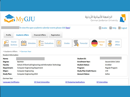 The Information Systems and Technology Center (ISTC) at the German Jordanian University (GJU) completed the digitalization of the German Year (GY) information management processes within the MyGJU university portal. In the first phase of the GY, all GJU Bachelor students study for one semester in one of the GJU’s partner universities. Whereas, in the second phase of the GY, the students spend another semester doing an obligatory internship of at least 20 weeks full time with a German company.