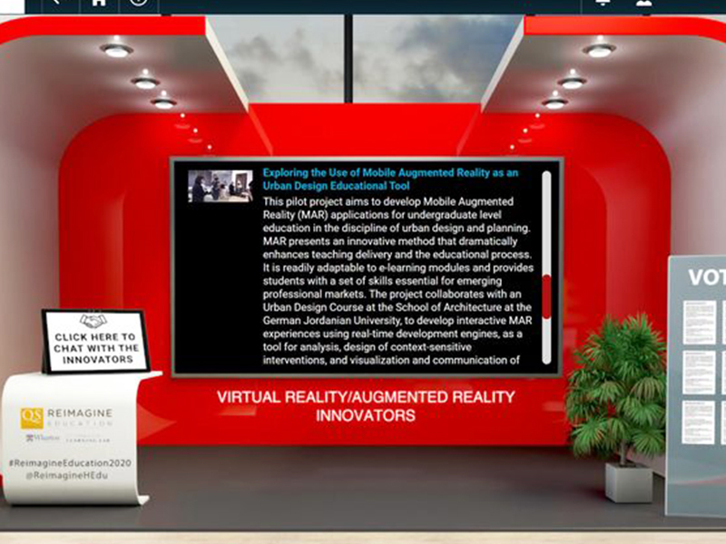 The project: "Exploring the Use of Mobile Augmented Reality as an Urban Design Educational Tool" based on Narmeen Marji's Spatial Planning Master's thesis has been shortlisted as one of the top 9 AR/VR applications in education globally by the world's most prestigious educational award (QS: Reimagine Education) hosted by QS (Quacquarelli Symonds), The world's largest international higher education network best known for their world rankings and analysis of higher education institutions. The project was supervised by Prof. Dr. Mohammad Ali Yaghan and Dr. Janset Shawash.