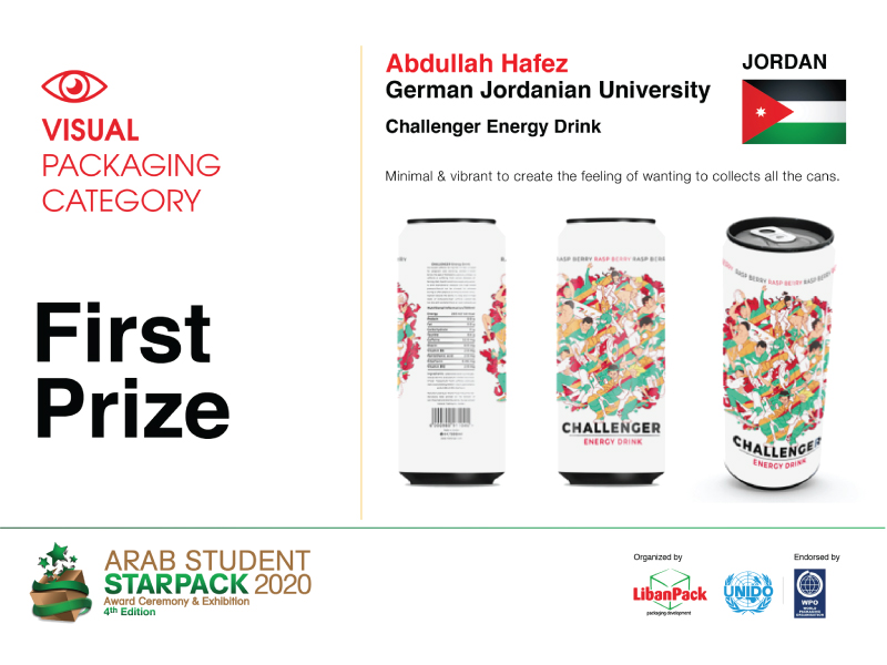 For the Visual Packaging Category, Abdullah Hafez won the first prize for the project, Challenger Energy Drink Can Design, besides the PAN ARAB AWARD.