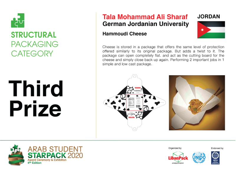 For the Structural Packaging category, Tara Yazid Weshah won the first prize for the project Halva Packaging design, Hayat Abudahab won the second prize for the project NOQTA T-shirt Packaging, and for the third prize, Tala Sharaf won for her project Hammoudi Cheese.