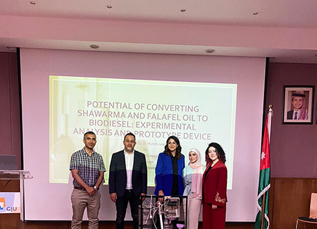 Students, Dana Koreek, Rama Alghzawi and Shatha Khrewesh,  from the School of Natural Resources Engineering and Management (SNREM), at the German Jordanian University (GJU) discussed the graduation project titled "Converting Shawarma and Falafel Oil into biodiesel" under the supervision of the Head of the Department of Energy Engineering, Dr. Mustafa Jaradat.