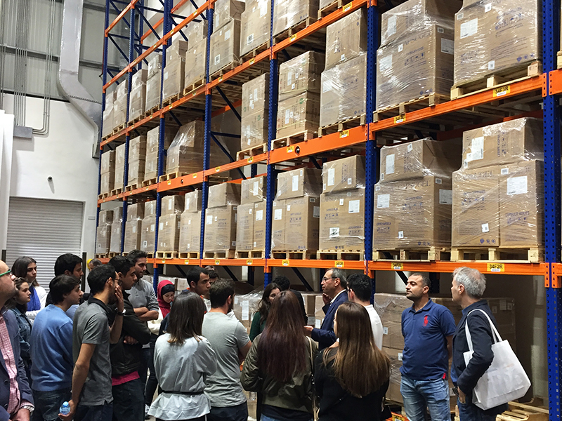 The warehouse was divided into three parts, 1 "Finished goods", 2 "Packaging materials", and 3 "Penicillin" (which is not stored with the other finished goods due to chemical reasons). The students were able to experience a real model, live action of how a warehouse operates, how special forklifts are needed for the narrow aisles (1.7 m width), and how the bin location codes on every column and row help in identifying the inventory. Furthermore, they learned about how inbound and outbound activities take place. Finally, the GJU students were introduced to both the security and safety systems used at Hikma warehouses.