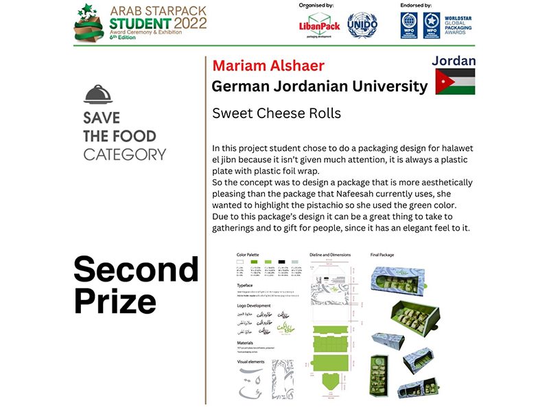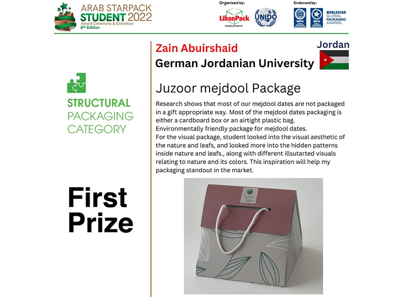 Students of the Department of Design and Visual Communication at the School of Architecture and Built Environment (SABE) at the German Jordanian University (GJU) won eight prizes in the Arab StarPack Student 2022 competition in Jordan, which is organized annually by the Lebanese Center for Packaging “Libanpack” and the United Nations Industrial Development Organization (UNIDO) for university students in Arab countries.