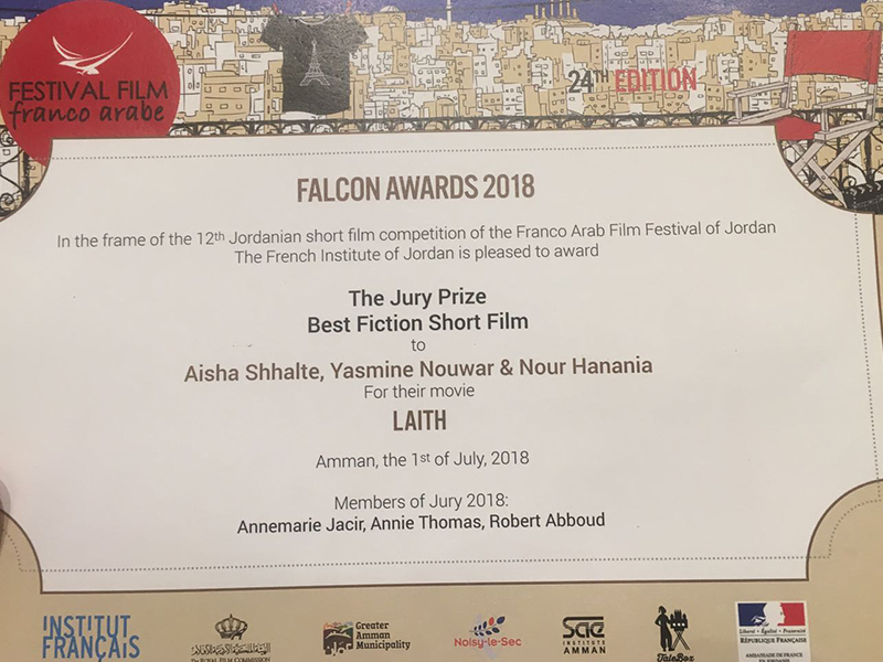 The German Jordanian University (GJU) students from the Department of Design and Visual Communication- School of Architecture and the Built Environment (SABE) won the jury prize for the "Best Fiction Short Film" of the 12th Jordanian short film competition the Falcon Awards 2018 in the Franco Arab Film Festival.