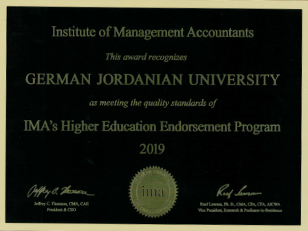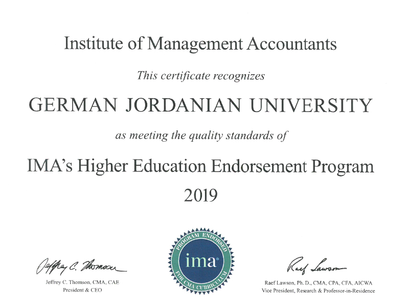 On Monday, April 29, 2019, the German Jordanian University (GJU) is proud to announce that the International Accounting Department at the School of Management and Logistic Sciences (SMLS) –has earned endorsement by IMA® (Institute of Management Accountants), one of the largest and most respected associations focused exclusively on advancing the management accounting profession.