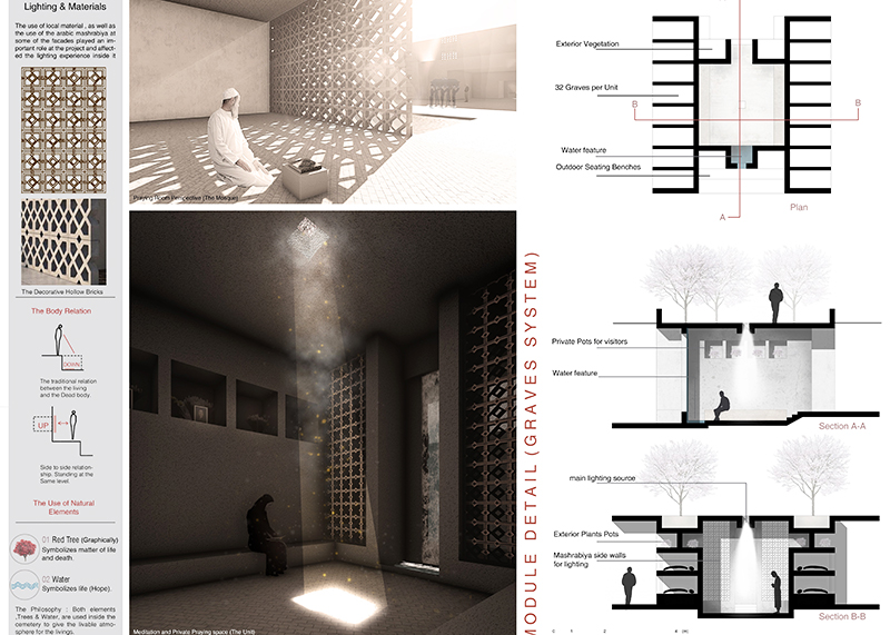 Shelbayh’s graduation project (Living Memorial) which won the 2nd prize dealt with cemetery transformation in Jordan- cemeteries are often located in city suburbs. As the city grows, the burial grounds become more and more integrated into the city, at which point they occupy space that could be used in other ways. This is the case in Amman, where many cemeteries are in poor condition as well.