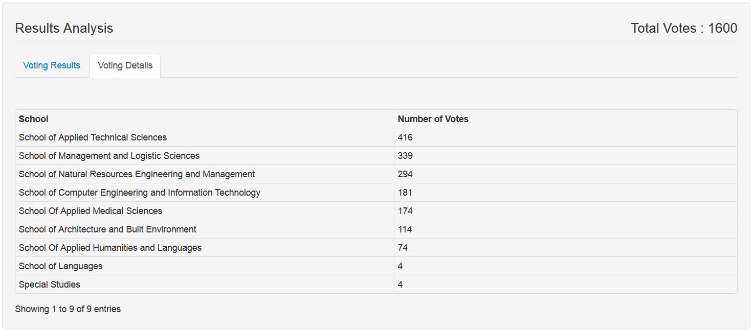 The participation percentage reached 40% of the students, including those who are in Germany. The highest school that voted for the candidates was the School of Applied Technical Sciences SATS (around 25% of the votes), followed by the School of Management and Logistics Sciences SMLS (around 21% of the votes), and thirdly was the School of Natural Resources and Environmental Management SNREM (around  18%), and the rest was distributed among the remaining four schools.