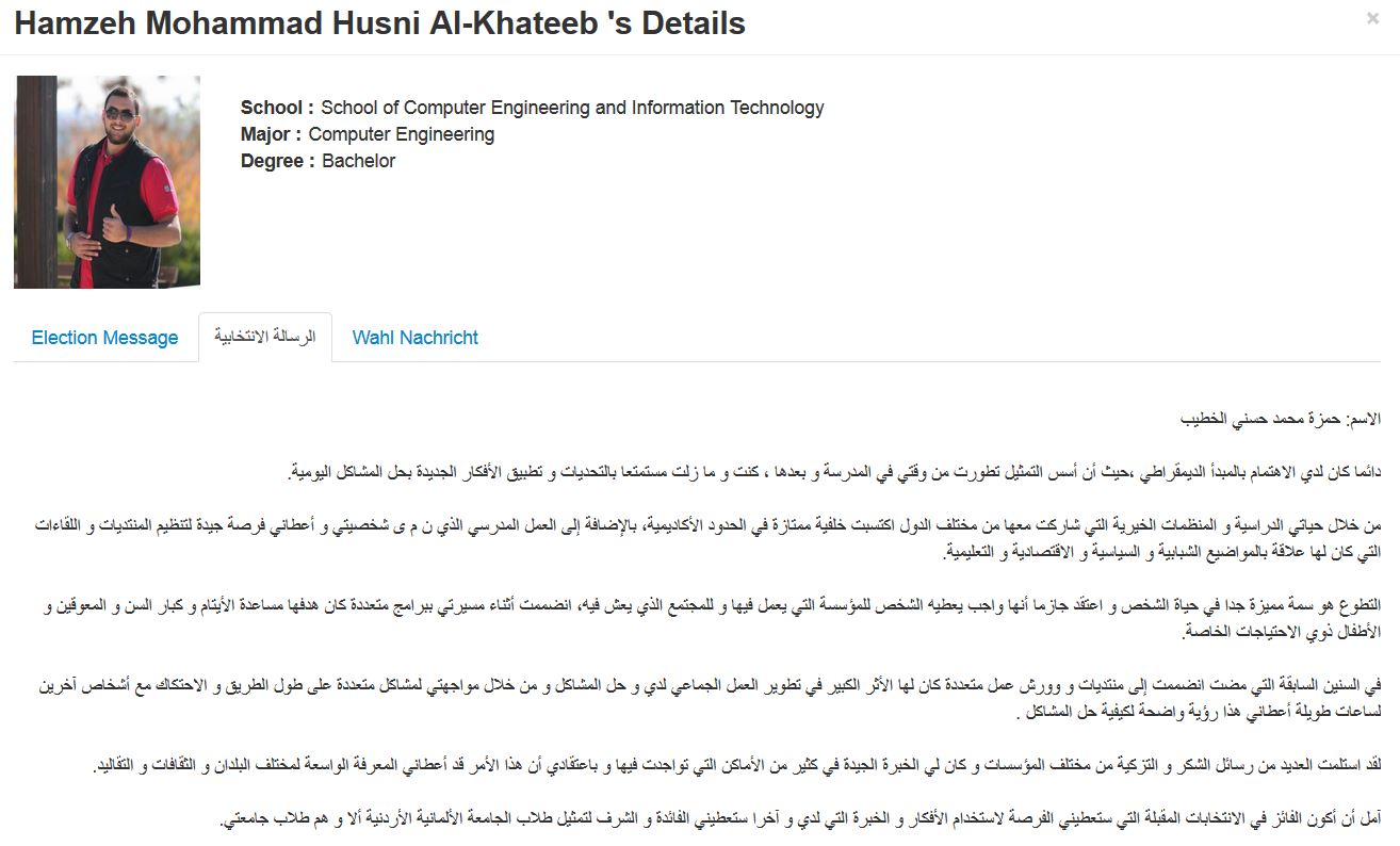 The student body of German Jordanian University (GJU) has elected their representative in the university council, which is the highest council in determining the university’s strategic directions. The fully online elections took place on Dec 20th, 2016, allowing 1600 of the university students including those in Germany to electronically cast their votes to select the strongest forerunner candidate.