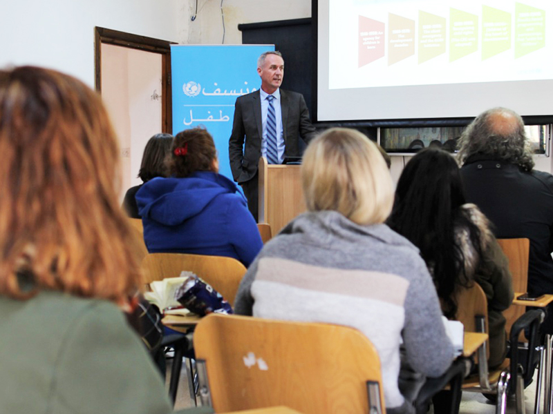 During his lecture, Jenkins reviewed in the presence of the President of GJU Prof. Manar Fayyad, the mechanisms through which the organization and its projects operate. Explaining that in the past five years UNICEF has focused on the emergency response to the needs of Syrian refugee children.