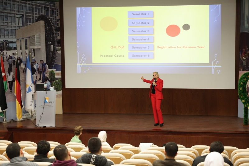 The German Language Center (GLC) at the German Jordanian University (GJU) organized a welcoming meeting, “Freshmen Event,” for students enrolled in German Language Course I, with the participation of around 550 students and members of the German language teaching staff. The event aimed to introduce new students to the “German Dimension,” one of the key pillars of studying at GJU.