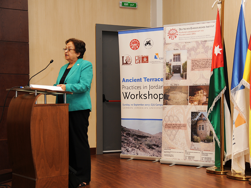 On Sunday 10th of September 2017 The Center of the Study Natural and Cultural Heritage at The German Jordanian University (GJU), organized a workshop on “Ancient Terrace Practices in Jordan” under the patronage of the Director General, Department of Antiquities (DOA), Dr. Monther Jamhawi, with the collaboration of The German protestant institute of Archeology (GPIA) and The German Archaeological Institute-Berlin.